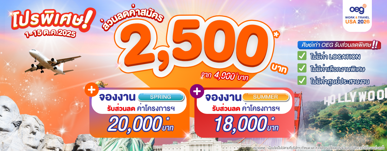 • ส่วนลดค่าโครงการฯ นี้ ใช้เป็นส่วนลดค่าธรรมเนียมโครงการ OEG Work and Travel USA 2026 งวดที่ 2 เท่านั้น