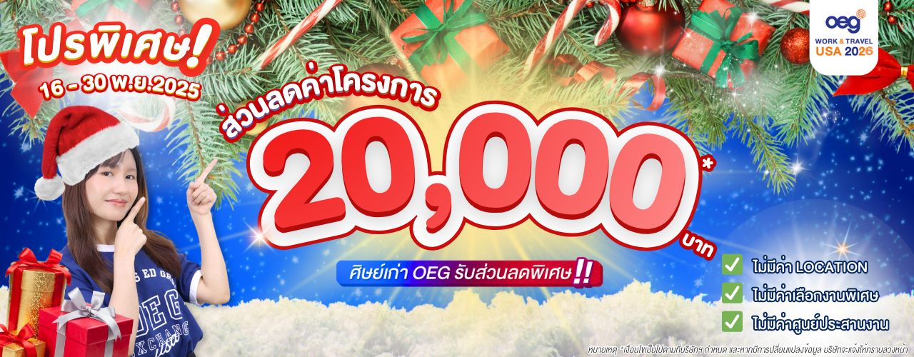 โปรโมชันสำหรับนักศึกษาศิษย์เก่า OEG ทุกโครงการ ทั้ง Work and Travel USA และ High School Exchange ที่เข้าร่วมโครงการจนสิ้นสุดโครงการฯ โดยสมบูรณ์ โดยจะต้องลงทะเบียนยืนยันสถานะ 👉คลิกที่นี่