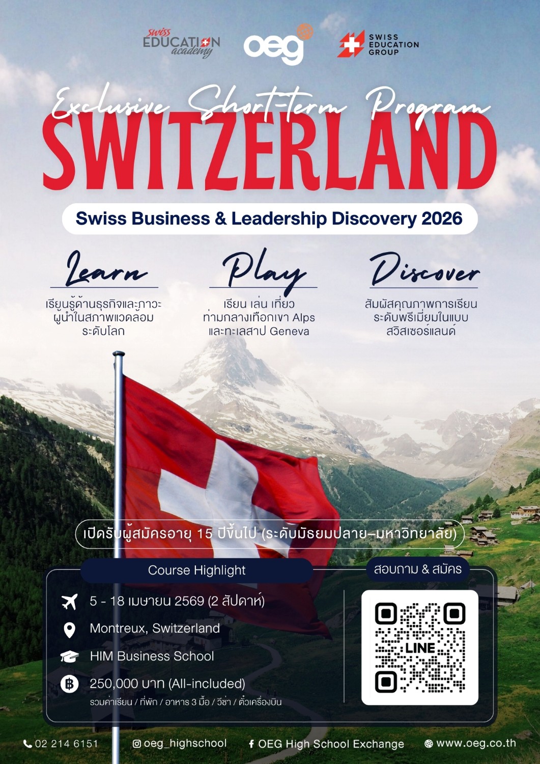 - คอร์สเรียน Swiss Business & Leadership Discovery 2026 ผู้เรียนจะได้เรียนรู้ด้านธุรกิจ ภาวะผู้นำ และทักษะการทำงานและใช้ชีวิตในโลกยุคสากล ในรูปแบบที่สนุก เข้าใจง่าย และลงมือทำจริง
